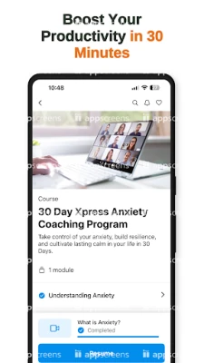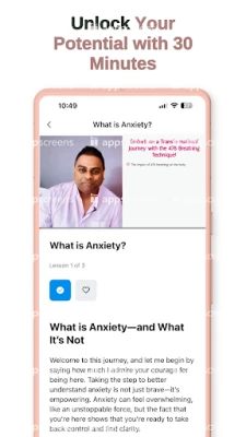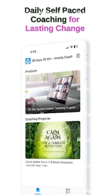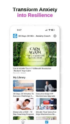 Lietotnes "30 Days 30 Min - Anxiety Coach" centrā ir ikdienas koučinga video sesijas, kas izstrādātas tā, lai ikviena no tām būtu pietiekami īsa un efektīva, lieliski iekļaujoties pat vispiepildītākajā dienas plānā. Šie video materiāli sniedz specializētas metodes trauksmes mazināšanai un stresa pārvaldīšanai, palīdzot jums atgūt mieru un kontroli. Katrs 30 dienu izaicinājums piedāvā strukturētu ceļvedi ceļā uz labāku pašsajūtu, ļaujot jums detalizēti sekot līdzi savam progresam un vizualizēt katru sasniegumu.