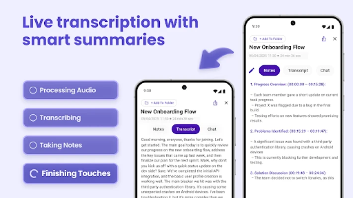 Gan aizņemtiem profesionāļiem, gan mērķtiecīgiem studentiem Instant AI Notes And Transcripts ir neatsverams sabiedrotais. Ar vienu pieskārienu sāciet ierakstīšanu, un vērojiet, kā jūsu ekrānā reāllaikā parādās transkripcija, ko nodrošina tādas funkcijas kā Minutes AI: Meeting Notes. Tas ir kā kluss partneris, kas uzklausa un uzraksta visu svarīgo. Pateicoties AI Note Taker: AI Transcribe, jūs varat pilnībā koncentrēties uz diskusiju, zinot, ka precizitāte un pilnīgums ir garantēti. Šis risinājums palīdz jums saglabāt kontroli un vienmēr būt soli priekšā, efektīvi pārvaldot informāciju.