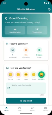 Mindful Minutes - Meditācija palīdz izprast emocionālos modeļus, veidot konsekvenci un atrast mieru. Šī privātumu cienošā lietotne piedāvā garastāvokļa uzskaiti un ieskatu, kā meditācija uzlabo jūsu labsajūtu. Sāciet savu ceļojumu uz mierīgāku ikdienu bez traucējumiem.